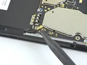 Используйте острие лопатки, чтобы поддеть и отсоединить антенный кабель от дочерней платы.