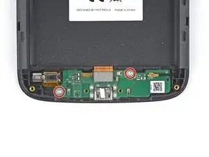 Удалите винты Torx T5 длиной 3 мм, фиксирующие дочернюю плату к раме телефона.