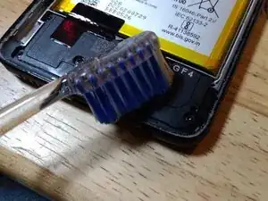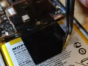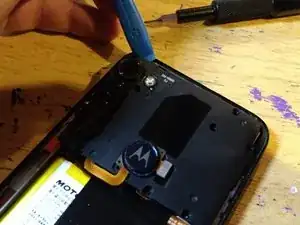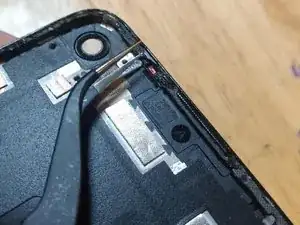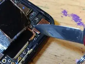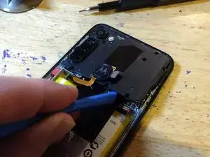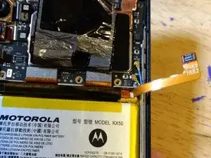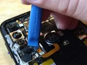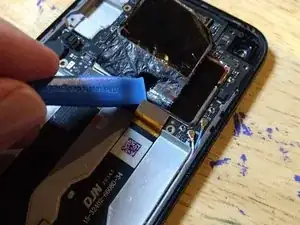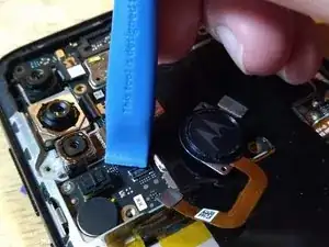 После снятия крышки материнской платы отсоедините датчик отпечатка пальца от телефона с помощью лопатки и отложите его в сторону.