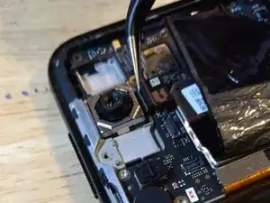 Чтобы снять фронтальную камеру, очень аккуратно разрежьте медную ленту, затем извлеките ленточный кабель с платы.