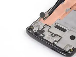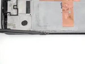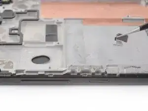 Используйте пинцет, чтобы поднять два серебристых фиксирующих кронштейна, расположенных по краям кнопок громкости и питания, строго вверх и снять их с телефона.