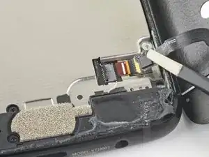 Используйте инструмент для вскрытия, чтобы откинуть широкий фиксатор в ZIF-разъёме кабеля дисплея, расположенном вверху справа телефона.