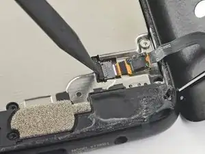 Используйте острый край лопатки, чтобы откинуть фиксатор в ZIF-разъёме датчика отпечатков, расположенном внизу справа телефона.