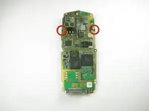 Предупреждение: Два средних винта закреплены в основании телефона двумя чёрными пластиковыми втулками. Используйте пинцет, чтобы аккуратно выкрутить винты, чтобы не сломать пластиковые втулки.