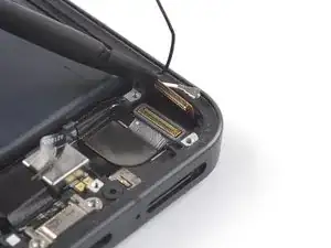 Нажмите пинцетом в сторону левого края телефона, чтобы освободить запорный язычок кронштейна разъёма.