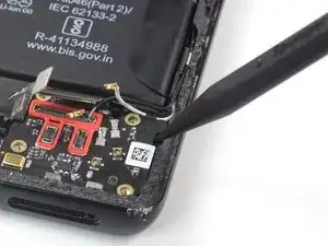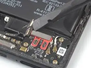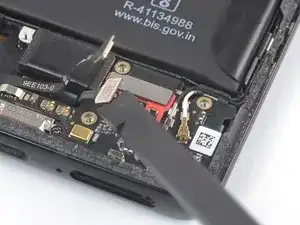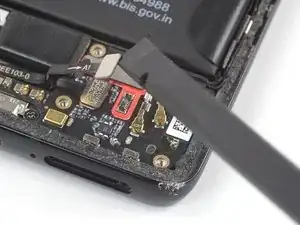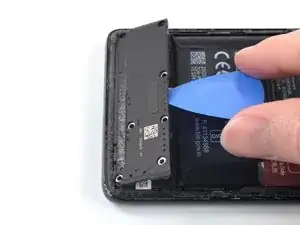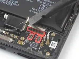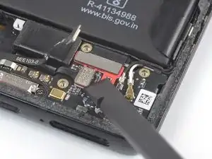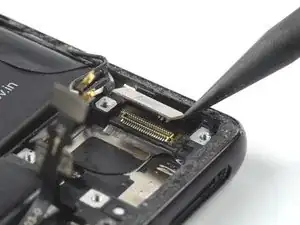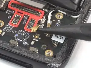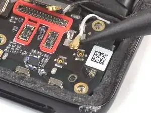 Используйте лопатку, чтобы отсоединить кабель платы антенны от дочерней платы, поддев разъем прямо вверх из его гнезда.