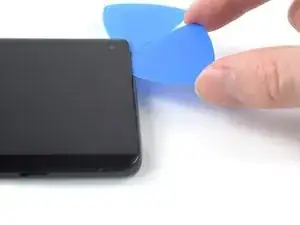 Вставьте пятую монтажную лопатку под верхний правый угол экрана и проведите ею вниз по правому краю телефона, чтобы разрезать оставшийся клей.