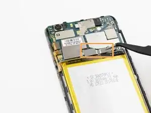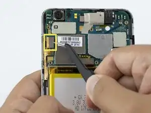 С помощью изогнутых пинцетов отсоедините чёрный ленточный кабель. Это необходимо, чтобы отключить аккумулятор.
