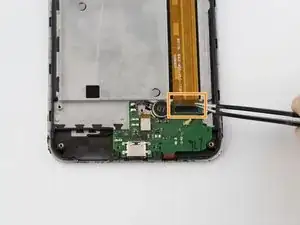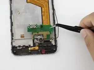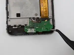 Изогнутыми пинцетами аккуратно приподнимите (но не снимайте) зелёную плату с телефона.