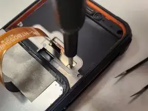 Используя отвёртку PH0, выкрутите длинный винт с кронштейна, фиксирующего кабель ЖК-дисплея.