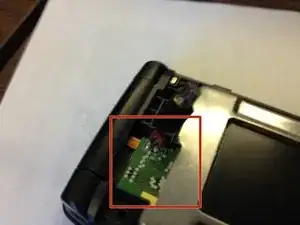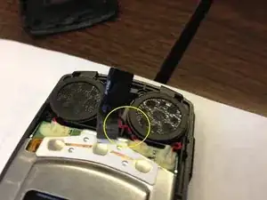 Рядом с шарниром телефона находится зелёная печатная плата.
