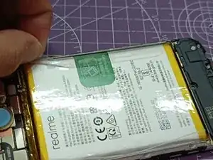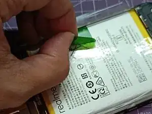 Отключите аккумулятор от материнской платы и снимите пластиковые защитные элементы с обеих сторон батареи. Потяните за зелёную вкладку крепко и осторожно, пока батарея не освободится.