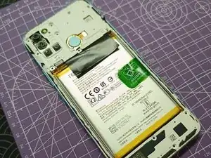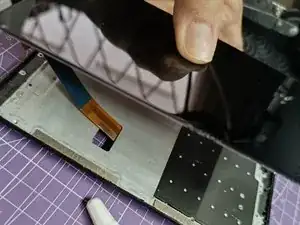Удалите клейкую плёнку и отключите экран от материнской платы. Затем экран можно поддеть и снять спереди.