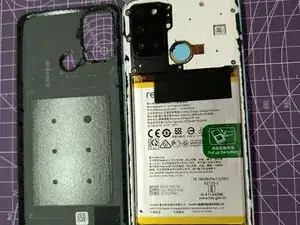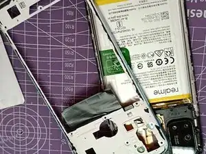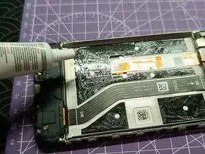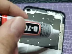 Нанесите силиконовый клей на тёмные участки, чтобы зафиксировать батарею. Убедитесь, что батарея подключена к материнской плате. Установите пластиковую рамку и протестируйте телефон перед закреплением винтами.