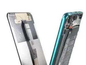 Протяните гибкий кабель дисплея через зазор в средней рамке и снимите экран.