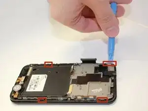 Отсоедините две защёлки, соединяющие плату и основание телефона, с помощью пластиковой лопатки.