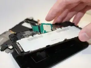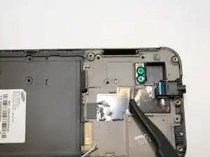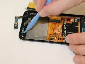 Используя пластиковой лопаткой, освободите главный разъём, передний динамик и камеру.