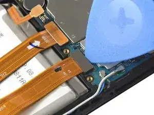 Используйте медиатор, чтобы отсоединить межсоединительный и шлейф дисплея, поддев разъёмы строго вверх из их гнёзд.