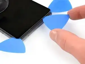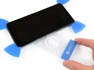 Вставьте второй медиатор под верхний правый угол и проведите его вдоль правого края до нижнего правого угла экрана, чтобы разрезать клей.