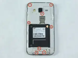 Найдите батарею в нижней части телефона. Аккумулятор квадратный, плоский и маркирован «SAMSUNG».