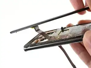 Удерживая металлический экран приподнятым и отведённым в сторону, используйте заострённый конец лопатки, чтобы поддеть разъём батареи и отключить его.