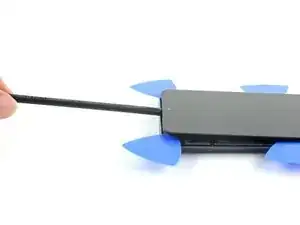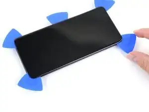 Вставьте третий медиатор в центральный зазор и проведите им к верхнему правому углу дисплея, чтобы разрезать клей.