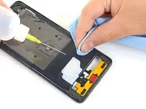 На этом шаге вы нанесёте изопропиловый спирт за экран, чтобы ослабить прозрачный клей в нижней центральной части устройства.