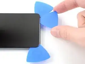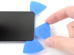 Во время этой операции используйте только кончик медиатора (4–5 мм), чтобы не запутаться с кабелем датчика отпечатка пальца под экраном и не порвать его случайно.