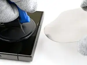 С помощью присоски приложите сильное и равномерное усилие, чтобы приподнять стекло, одновременно аккуратно продвигая iFlex между стеклом и дисплеем.