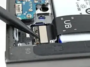 Используйте лопатку, чтобы поддеть и отсоединить разъём прижимного типа катушки беспроводной зарядки от материнской платы.