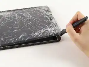 Экран может треснуть при снятии, поэтому остерегайтесь осколков стекла. При необходимости нагрейте область по краям экрана, чтобы ослабить клей, но не перегрейте пластиковую рамку планшета.