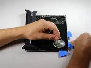 Поместите присоску поблизости от угла экрана и осторожно поднимите, чтобы создать зазор между сборкой передней панели и задней частью.