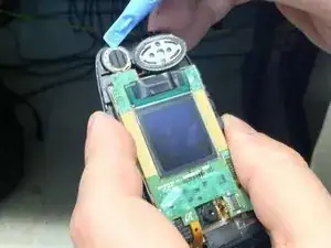 Пластиковым инструментом для вскрытия подденьте динамики из корпуса. Они расположены в верхней части задней стороны телефона.