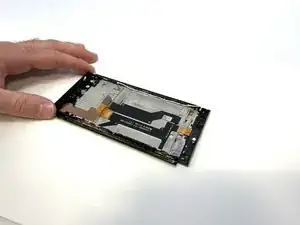 С помощью пинцета с изогнутыми концами осторожно снимите маленький металлический кронштейн с верхней левой стороны телефона.