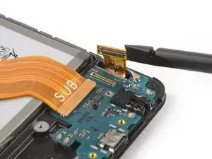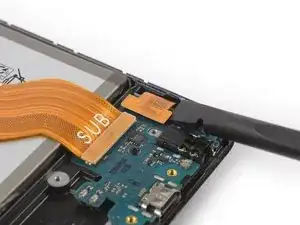 С помощью лопатки отключите шлейф дисплея в нижнем правом углу телефона.