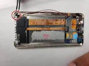 Динамик расположен в нижней левой части смартфона и соединён с платой красно-черным проводом.