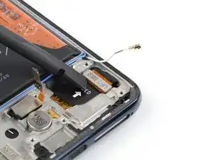 С помощью пинцета аккуратно освободите белый коаксиальный кабель от его укладки на дочерней плате и отведите его в сторону.