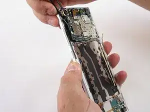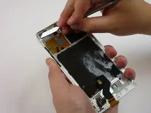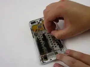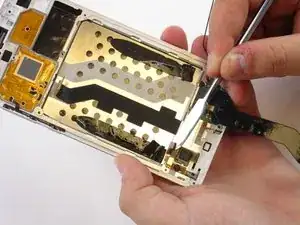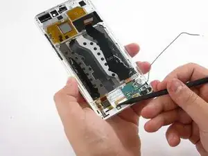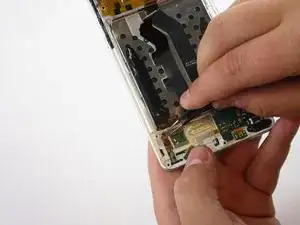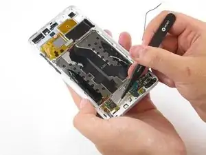 Используйте пинцет, чтобы отсоединить маленький шлейф с левой стороны возле кнопок регулировки громкости, поддев его вверх.
