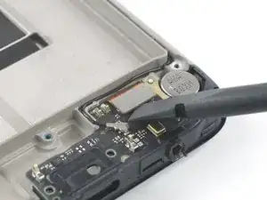 Сдвиньте медиатор к нижнему левому углу телефона, чтобы освободить пластиковые защёлки, удерживающие заднюю крышку.