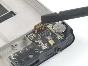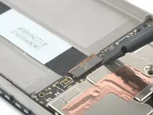 Используйте плоскую сторону лопаточки, чтобы поддеть и отключить кабель датчика отпечатка пальца в нижнем левом углу платы.