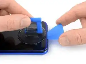 Просуньте медиатор до правого нижнего угла экрана, чтобы разрезать клей. Оставьте медиатор на месте, чтобы предотвратить повторное схватывание клея.