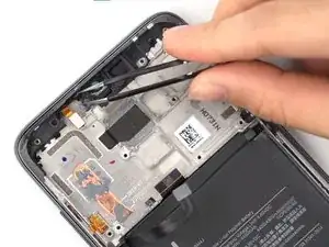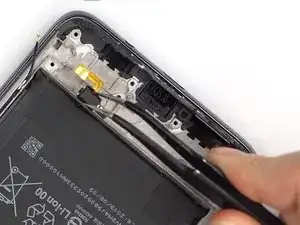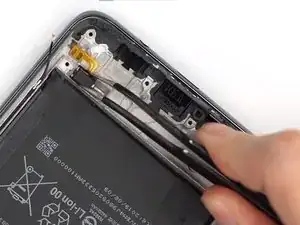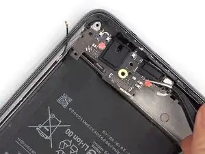 С помощью пинцета удалите небольшую чёрную пластиковую деталь, расположенную в верхнем левом углу телефона.