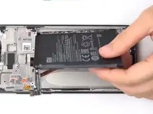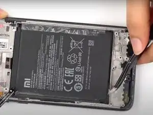 С помощью пинцета захватите чёрную пластиковую полоску в нижнем левом углу батареи.