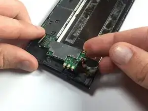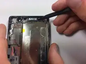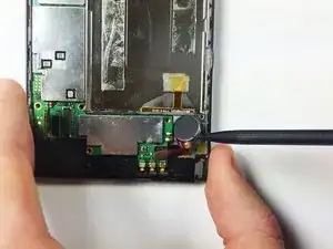 Используйте заострённый конец лопатки, чтобы поддеть под черный круглый вибромотор внизу справа телефона.