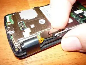 Край лезвия бритвы или другого подходящего инструмента используйте, чтобы отсоединить разъём динамика для уха от панели и освободить его.