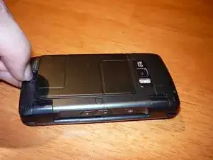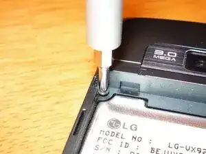 Удалите три заглушки винтов с края шарнира телефона, используя край бритвенного лезвия или аналогичный предмет. Они просто выскакивают.