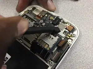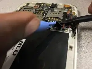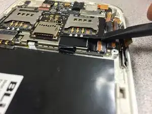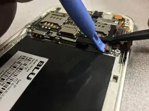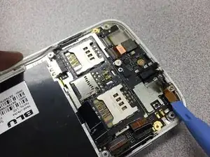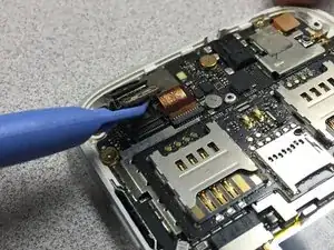 Для последнего ленточного кабеля используйте пластиковый медиатор, чтобы аккуратно приподнять плату под правым слотом для SIM-карты.
