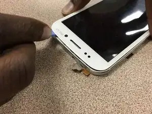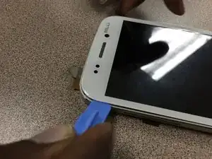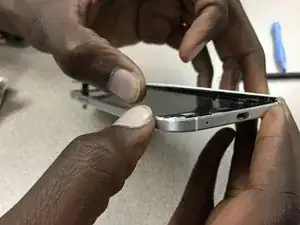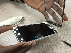 Когда экран нагрет и клей стал липким, вставьте пластиковый инструмент между стеклом и рамкой. Начните поднимать стекло по всему периметру рамки.
