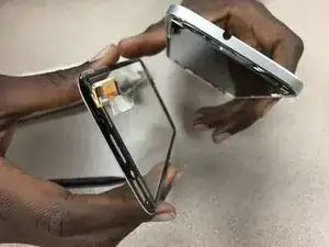 После отделения стекла от рамки лопаткой возьмите рамку и стекло обеими руками и разъедините детали. ВНИМАНИЕ: перед полным разъединением необходимо отсоединить ленточный кабель с задней стороны телефона.
