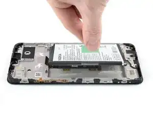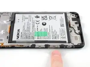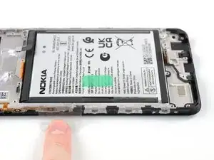 Аккумулятор в Nokia G22 закреплён на клее. Для отделения клея и извлечения аккумулятора предусмотрён тяговый язычок.